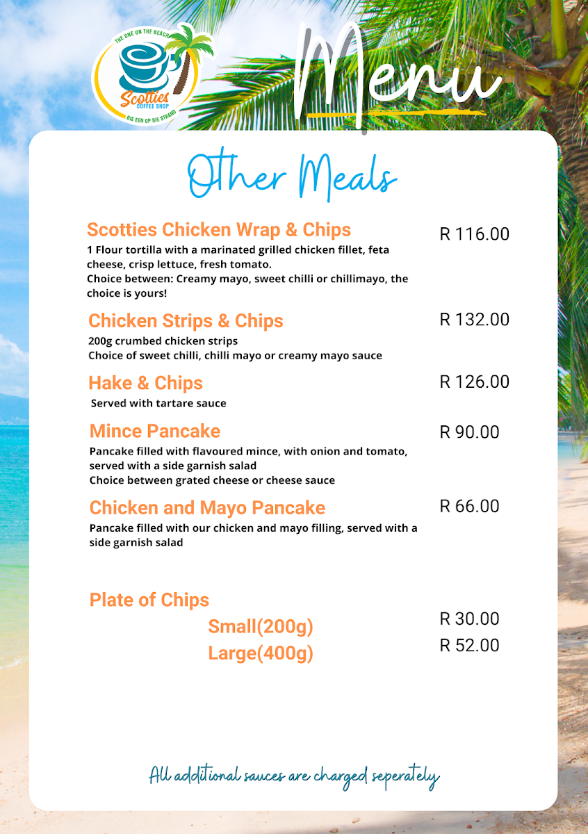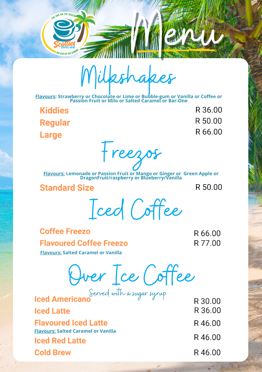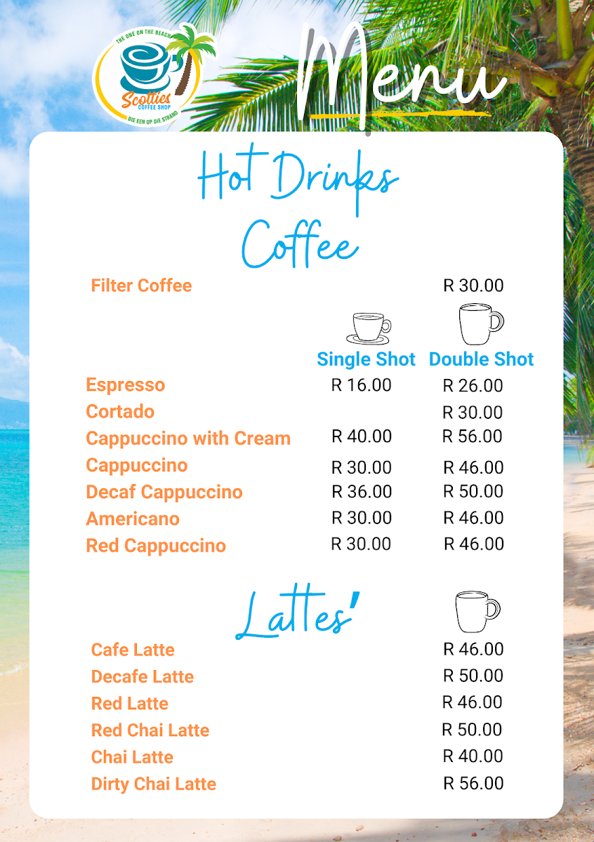 The menu at Scotties Coffee Shop offers a variety of options suitable for breakfast, light meals, and coffee breaks. It features a selection of hot and cold beverages, including different styles of coffee such as cappuccino, latte, and cuppachino, as well as Rooibos and Lipton Peach Iced Tea. Milkshakes and flavored coffee options like the Red Cuppuccino are also available.